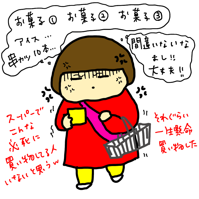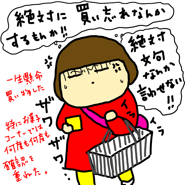 イライラが止まらなかった。ものすごくイライラしていて平常心ではない。こんな状態でイチを連れて買い物に行ったら買い忘れしてしまいそうだ。なのでお迎え前にスーパーへ寄る事にした。買い忘れなどあったらまたアレに何を言われるか分からない。絶対に買い忘れなんかするもんか!絶対に文句は言わせない!!そう思ってザワザワする心を抱えつつ、一生懸命買い物をした。汚い字で書かれた付箋を握りしめ、トーフに命じられた品物をひとつひとつ確認しながらカゴへ入れた。特にお菓子コーナーでは間違いがないか何度も何度も確認を重ねた。ザワザワする心に引っ張られない様に、一生懸命買い物した。恐らくスーパーの中でこんなに一生懸命買い物をしている人は他にいないだろうw