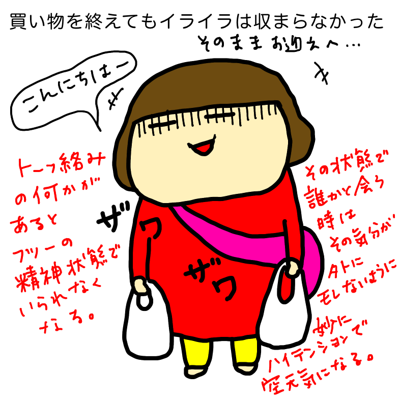 私の心のザワザワは止まらなかった。その状態でイチのお迎えに向かった。トーフにこんな風に嫌な事を言われたり、トーフ絡みの事件があると、ものすごくイライラザワザワして普通の精神状態ではなくなる。それを周りに悟られないようにその感情を隠そうとテンション高く空元気になる。その状態になると自分でも何を喋っているのかよく分からなくなるのだが、この日もそんな状態だった。先生やママ友と何を話しているのかよく分からなかった。とにかくイライラしている気持ちや傷ついている事を隠すために誰かと話すその時だけやたらテンションが高い自分がいた。