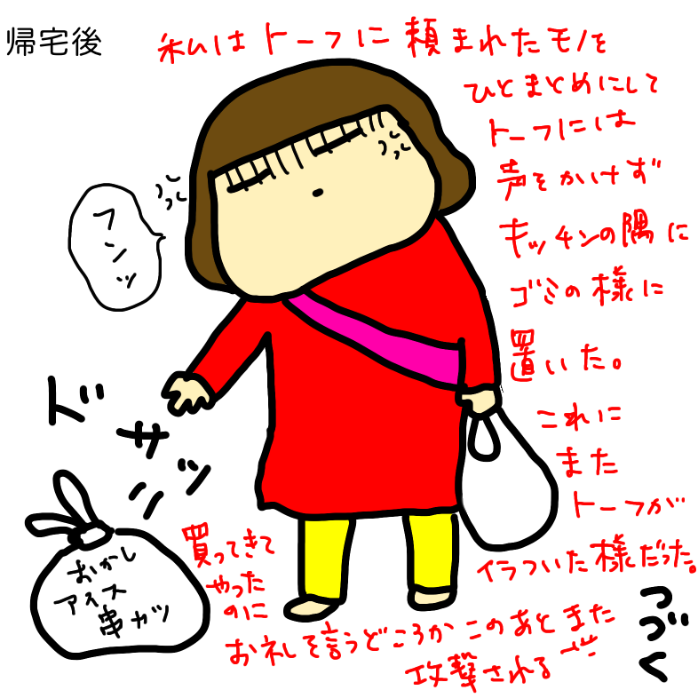 1人で買い物に行けるのは実は貴重な時間で、私はトーフに命じられた物をカゴに入れた後、日用品や食材をいくつか買っていた。そして袋詰めする際、トーフに頼まれた物と私が買った物は別々にした。帰宅後、トーフに頼まれた物はキッチンの隅っこにゴミの様に(笑)置き、自分が買ってきた日用品や食材だけを片付けた。私のそんな態度がトーフは気に入らなかったらしい。つーか、嫌味をいわれながらもわざわざ買い物に行ってやっているのだから、お礼のひとつぐらい言うのが礼儀だと思うが、お礼なんてとんでもなかった。この後またトーフに攻撃されることになる。つづく