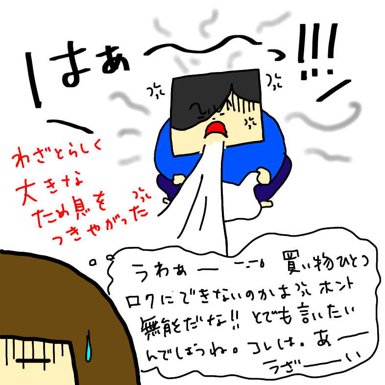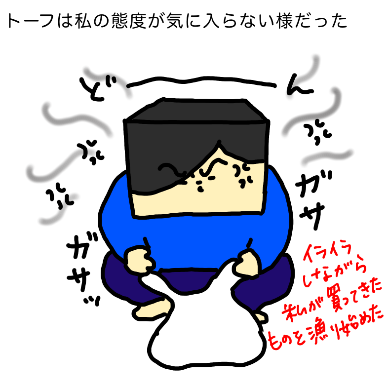 トーフに頼まれた物をキッチンの隅にドカッと置いて放置した事にトーフはイラついた様だった。トーフは私が床に置いた袋の中をゴソゴソと漁り始めた。大丈夫、何度も確認しながら一生懸命買い物してきたのだから突っ込まれるところはない…と思っていたら…攻撃が始まってしまった…。トーフは「あれ〜?!ま〜たソース忘れてきたんちゃうか〜?!」と、嫌味ったらしく大きな声で言った。そしてその後すぐに「はぁ〜〜〜っ!!」っと大袈裟に大きなため息をついた。その言動で「まったく、買い物ひとつロクにできないのかよ!!本当に無能だな!」とでも言いたいのだろうというのはすぐに分かった。
