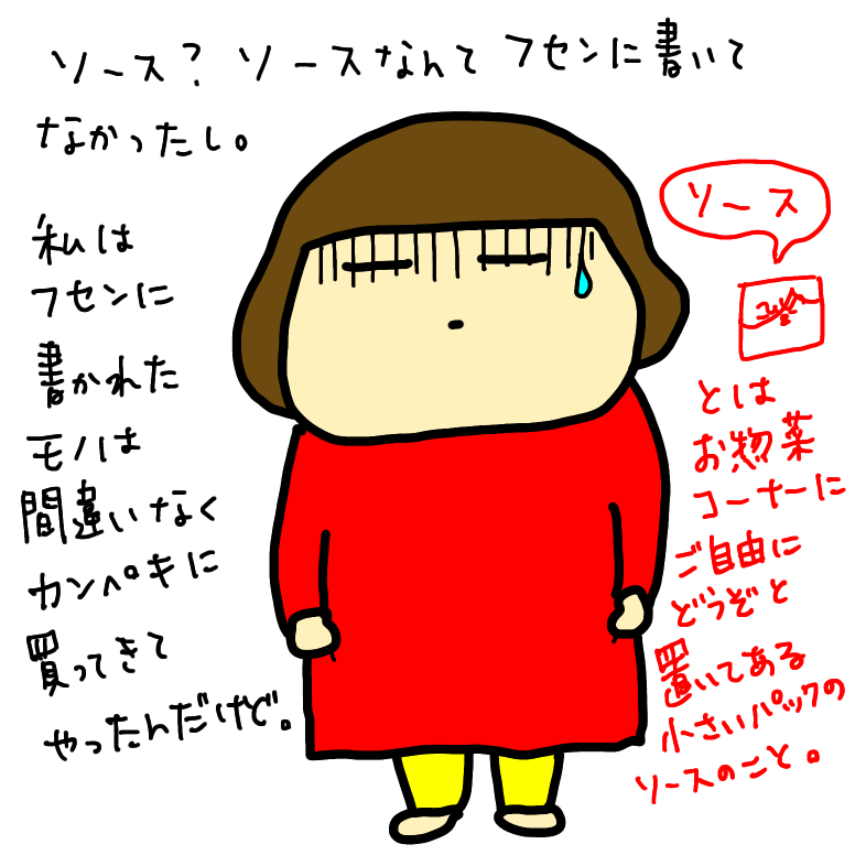お惣菜コーナーに『ご自由にお取りください』と置かれている小さい袋に入ったソースの事だ。そのソースが袋に入っていない事でトーフは私を責め始めた。私はトーフが汚ない字で付箋に書いた物を一生懸命買い物してきた。漏れも間違いもないのは何度も確認済みだ。トーフが私によこしたその付箋には『ソース』なんて書いてなかった。なので「は??ソース??ソースなんて書いてなかったけど。だいたい人に頼んでおいてその態度何なの?」とでも言ってやれば良いと思うが、この時の私は迂闊にもミスった!と思ってしまった。付箋の内容は完璧に買ってきたので、というか買ってきてやったので堂々としていれば良いのに、ミスった!という気持ちが表情に出てしまっていた。