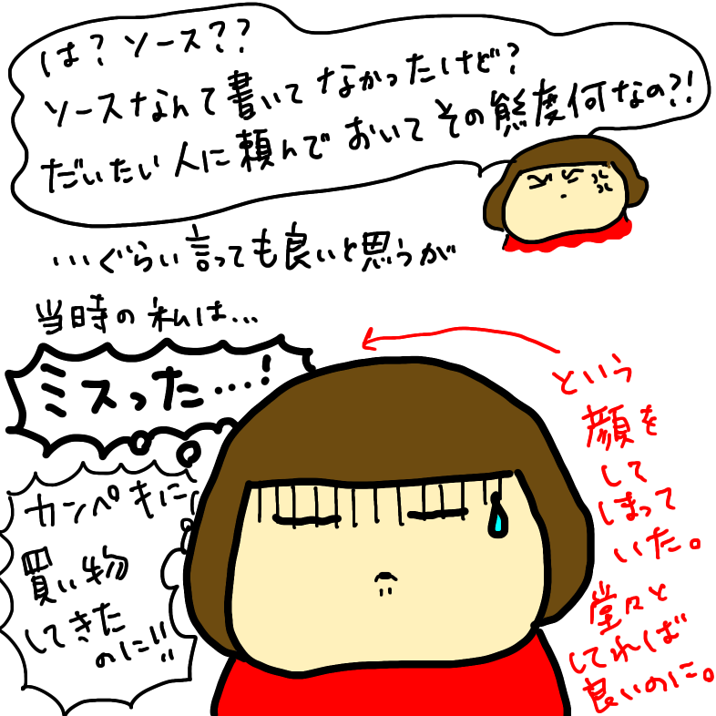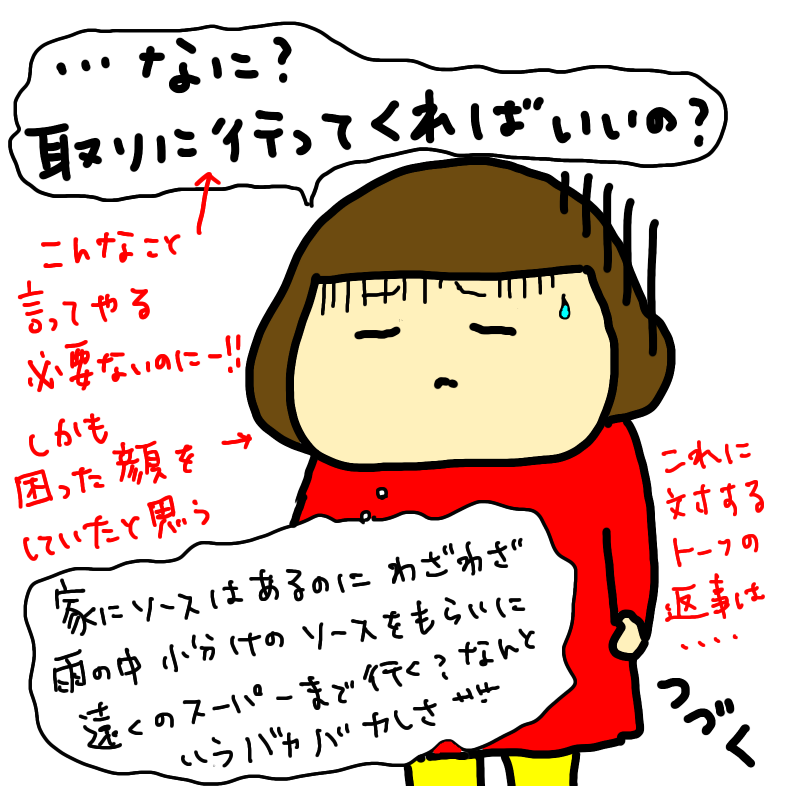 あんなに嫌なことを言われながら一生懸命買い物してきたのに、まだ何か言われるのか…とうんざりしていた。困った様な表情をしていたと思う。私はその困った表情のまま(こんな事言ってやる必要ないのに!!)「…なに?取りに行ってくればいいの?」とトーフに尋ねた。この雨の中わざわざ無料のソースを貰うために少し遠くのスーパーまで行くなんて馬鹿馬鹿しい。そもそも自宅にソースはあるというのに、本っ当に馬鹿馬鹿しい。時間の無駄だ。私がここまでしてやらなきゃいけないの??とモヤモヤした。私のこの問いに対してのトーフの返答は…?!つづく