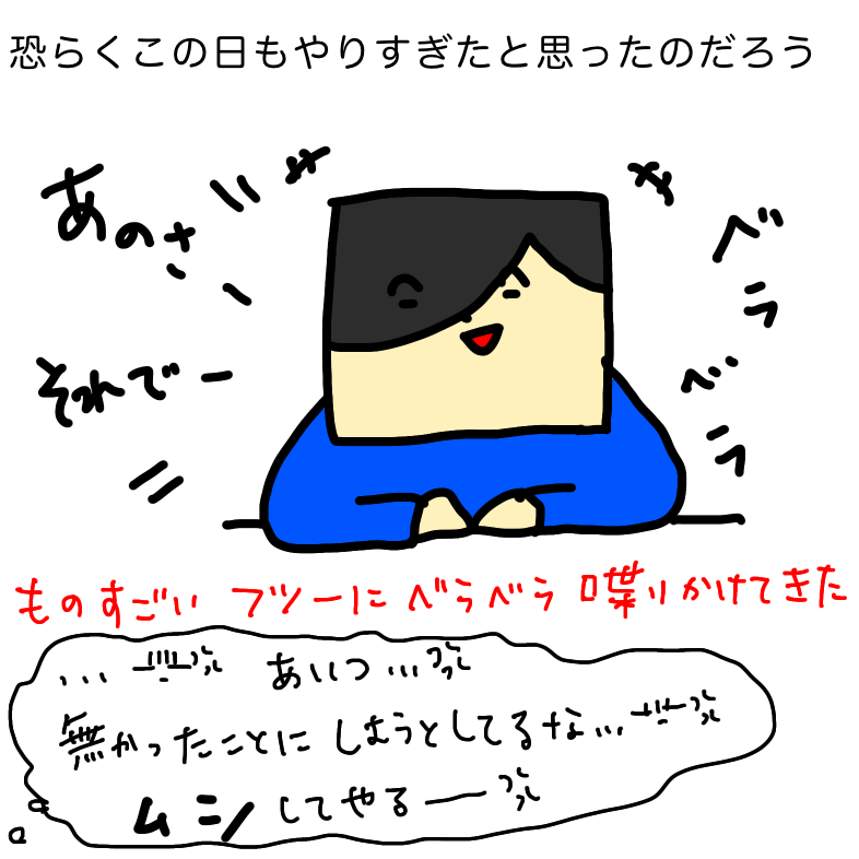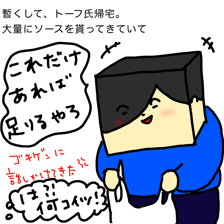 トーフは大量にソースを貰って帰ってきた。そして私にソースを見せて「これだけあれば足りるやろ」と機嫌良さげな表情で言った。この日の一連のトーフの言動に心底イライラしていた私はそんなトーフを一瞥して返事はしなかった。恐らくこの日もトーフはやりすぎたと思ったのだろう。ソースを貰ってきた後は、まるで何事も無かったかの様に機嫌よくベラベラと喋りかけてきた。また無かった事にするつもりだ。あれだけ言いたい放題言ってやりたい放題やっておきながら無かった事にしようとは何事か。やりすぎたと思うのなら謝ってはどうなのか。私はベラベラと喋りかけてくるトーフに反応しないで黙っていた。