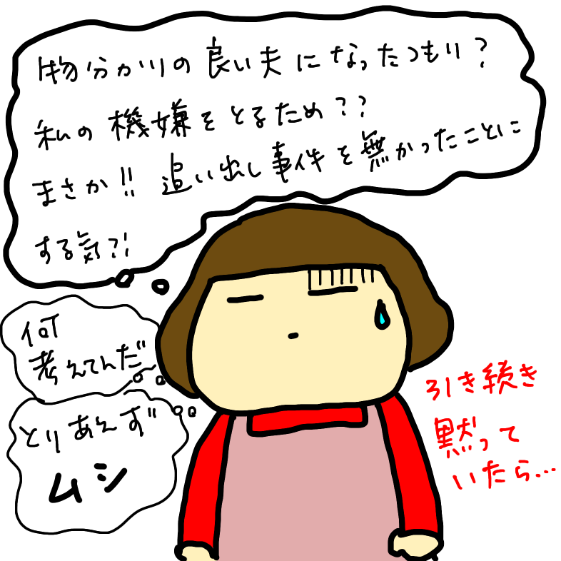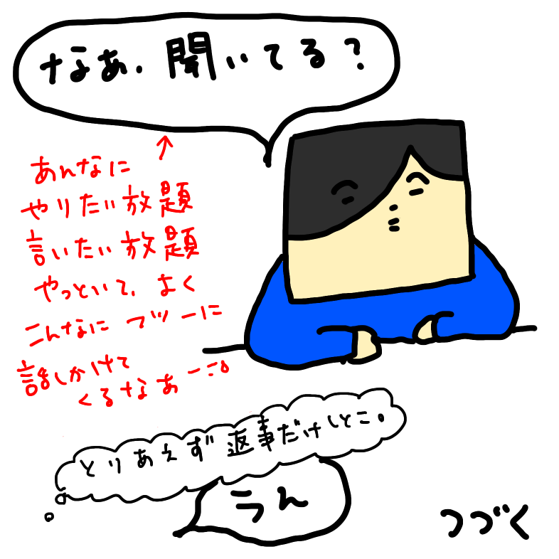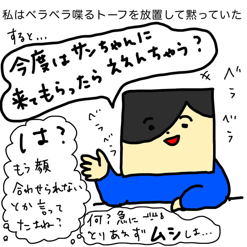 ベラベラ喋り倒すトーフw 喋り倒す中で突然「今度はサンちゃんに来てもらったらええんちゃう?」などと言い出した。は?サンちゃんのとことは顔を合わせられへん!などと豪語しておきながら?来てもらえって?何を考えているのか。何を思ってこんな事を言ったのか。物分かりの良い夫にでもなったつもりか?私の機嫌を取るために(機嫌を取って無かった事に持ち込む為?)私が乗ってきそうな話題を振ったのか?まさか、追い出し事件すら無かったことにする気?!など色々考えたが、トーフがそんな話を振ってきても私は引き続き黙っていた。するとトーフが「なぁ?聞いてる??」と畳み掛けてきた。私は「うん」とひと言だけ返した。つづく