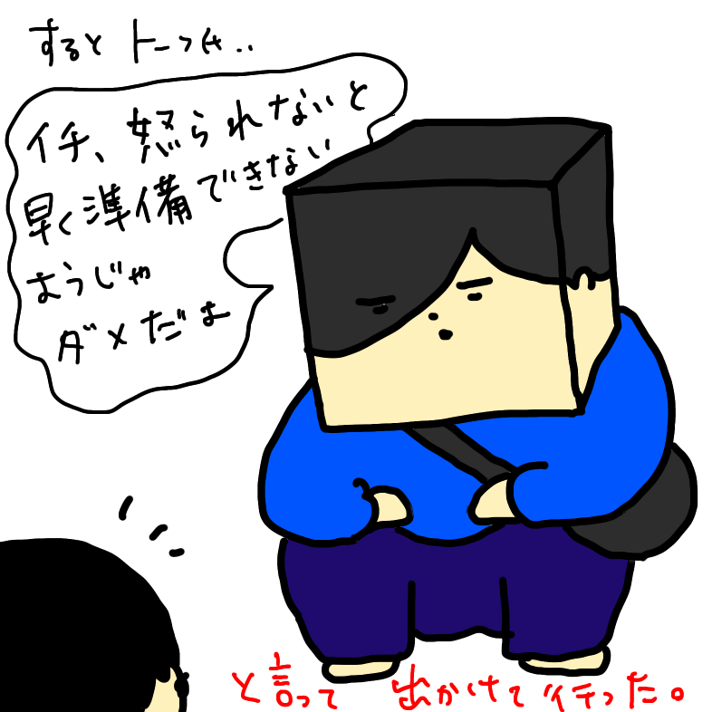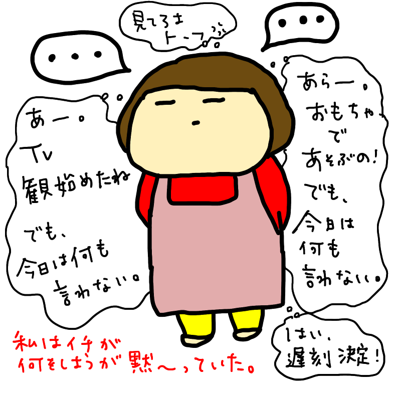 トーフは早く出る日で、子どもたちと同じぐらいの時間に起きる日だった。私は、前の夜トーフが言った事を採用して黙っている事にした。何もしないトーフは朝なぜバタバタするのかワーワー言う必要があるのかをよく分かっていない。お前の言う通りにしてやるよ、どんな事になるかよく見てろよと思った。起きてきたトーフはもちろんいつも通り自分の支度しかしなかった。私はこの日、イチがTVを観続けようが、おもちゃで遊び始めようが黙〜っていた。この感じだとイチは完全に遅刻だ。でも今日は何も言わない。偉そうにワーワー言うなと言ったトーフの意見を採用して黙っていてやる事にしたのだ。何もしないで偉そうな事を言うトーフがいかに愚かか知るが良い。