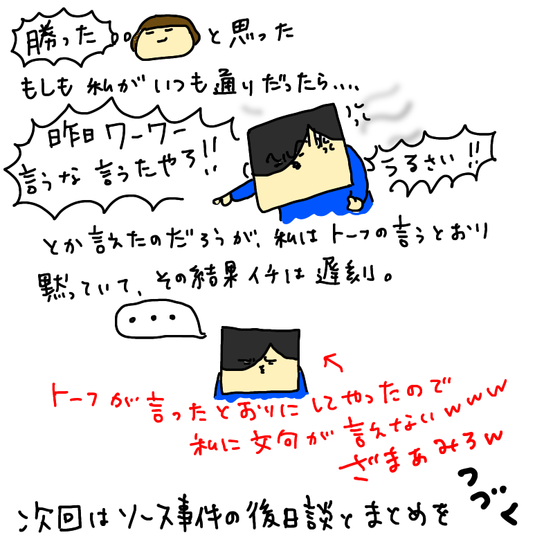 自由に遊んだりTVを観ているイチに「イチ、怒られないと早く準備できないようじゃダメだよ」と言って、私にはひと言も話しかけることなく仕事に出掛けて行った。勝った!と思った笑 仮にこの日、私がトーフの言いつけに背いてワーワー言ったとしたらまた私を攻撃するつもりだっただろうが、この日の私はトーフの言った事を採用して黙っていた。トーフの言う通りにした結果、イチは遅刻だ。トーフの発言をトーフへ投げ返すような形になった為、私に何も言えなかったのだろう笑 ざまぁ見ろであるwこんな感じでソース事件は終了するのだが、実はこの話には後日談がある。次はその後日談とまとめを。